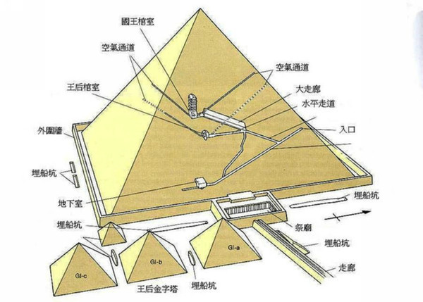 胡夫大金字塔内有铺道、石阶、通风道和墓室。室分3层,处塔底正中地下30米深处,室上有3层房间,加三角形顶盖。四条坑道分别指向当时正在穿越子午线的四颗特殊恒星。它们分别对正小熊星座的第二颗星“帝星”、大犬座最明亮的第一颗星“天狼星”、“北极星”及天龙座第一星“右极星”。