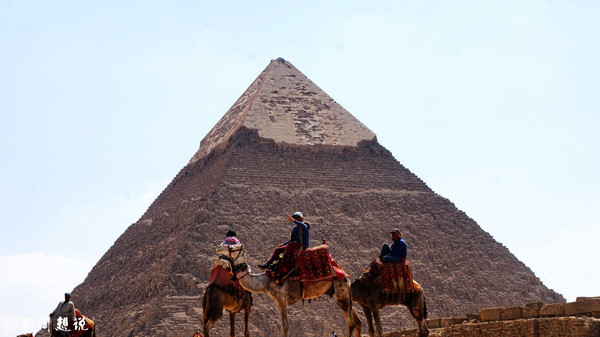 前方是高143.5米的海夫拉金字塔,是埃及第二大金字塔,是古埃及第四王朝(约公元前2575年至公元前2465年)的第四位法老海夫拉的陵墓。由于所处的位置比胡夫金字塔高,因此,从外观看,比胡夫金字塔高。