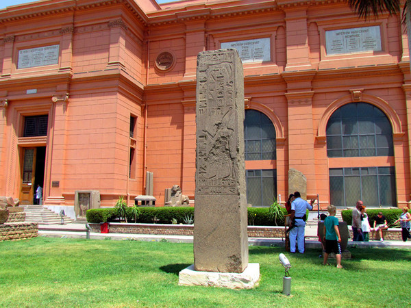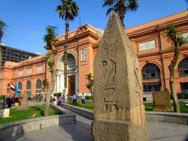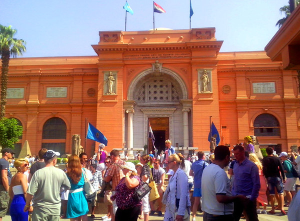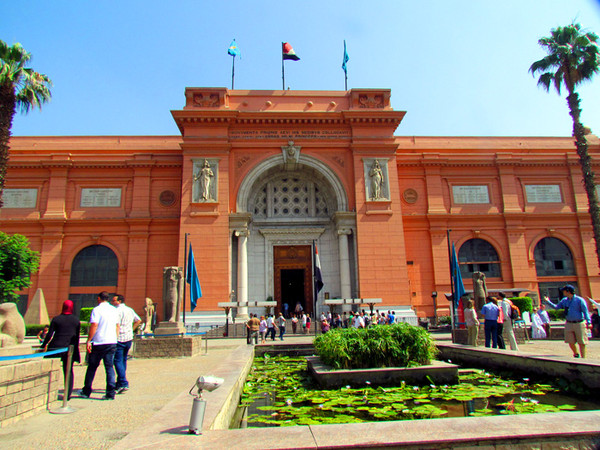 记者一行首先来到位于开罗尼罗河东岸的埃及国家博物馆。该馆分为室内与室外两个部分,室内部分不允许拍摄。这是一座具有 3000 多年悠久历史的古代埃及文明的遗物宝库。导游亚瑟介绍说:这里共收藏有各种文物12万件,目前对外陈列展出的只有4 万件,其余未展出的文物均在博物馆的地下。因这座博物馆以广为收藏法老时期的文物为主,埃及人又习惯地称之为“法老博物馆”。