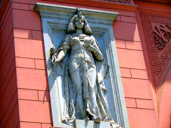 走进埃及博物馆,展现在人们眼前的是一座壮观古老而豪华的红色双层石头建筑物,接着在博物馆的庭院中,到处矗立的文物石像等令人目不暇接。只见博物馆入口的设计融入了古埃及艺术的特征:大门的外廓是一个圆形拱门,拱门两侧的壁龛中各有一个将法老形象欧式化的浮雕,其中一个持有纸莎草,另一个持有莲花,分别象征古代埃及的南北方。