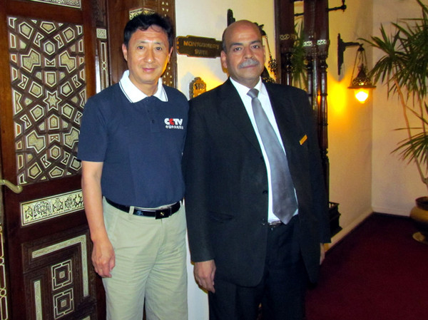 2013年5月8日晚,当我在这家饭店寻觅当年开罗会议在此遗迹的时候,竟然遇到了意外的惊喜。在饭店三楼的走廊里,记者一行遇到一位饭店服务员,我很礼貌地用英语向他问晚安并点头致意,他微笑地看看我停顿了片刻,然后友好地悄声引我走到一个房间,打开了房门让我进去,进屋开灯后他指着墙上挂的一幅照片让我看。