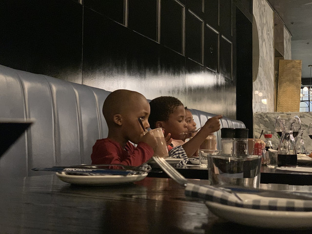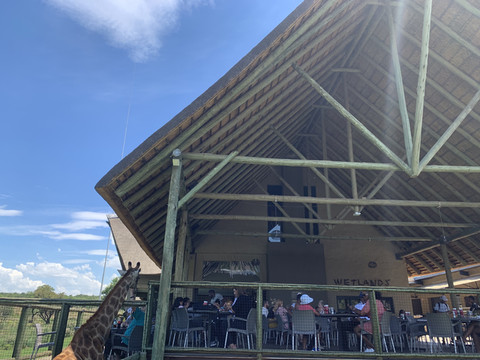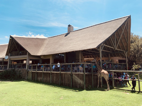 和狮子的第一次亲密接触结束后,我们一行人又来到了长颈鹿餐厅,现场人声鼎沸,餐厅提供西式简餐,可以边吃边和长劲鹿互动,趣味十足。
