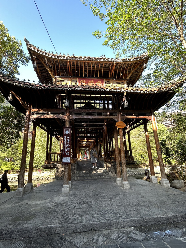 从景区北门进去,乘几分钟观光车到苗寨门口。进了寨门就是7号风雨桥,依次至1号风雨桥,大概3公里路程。