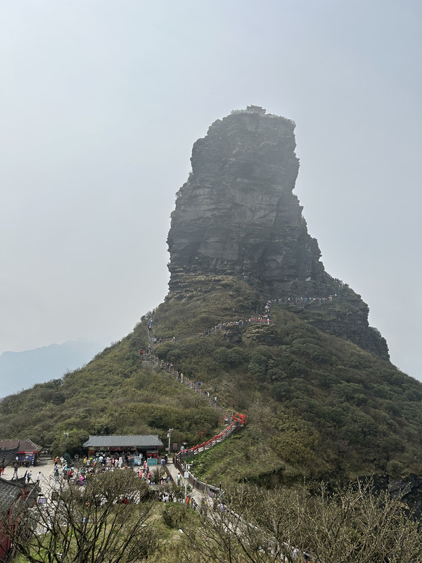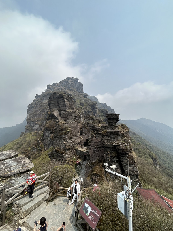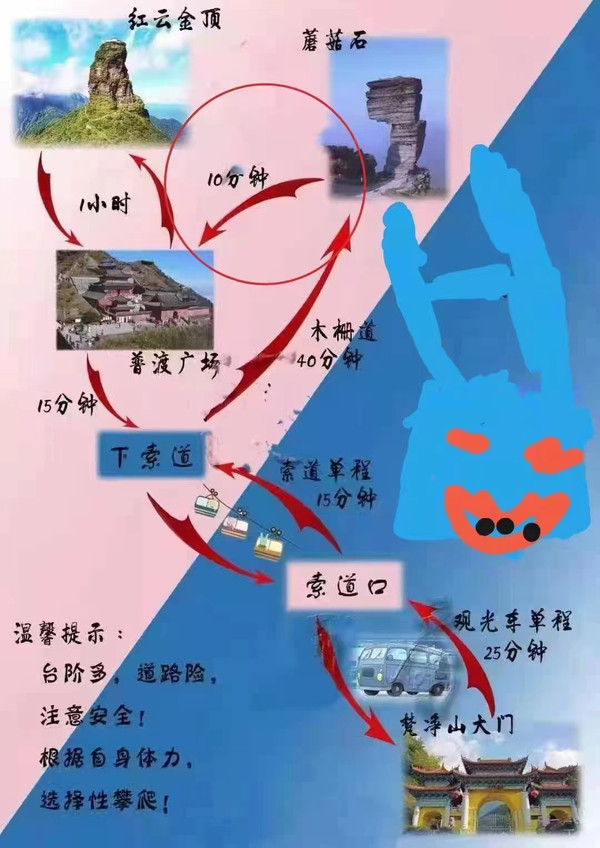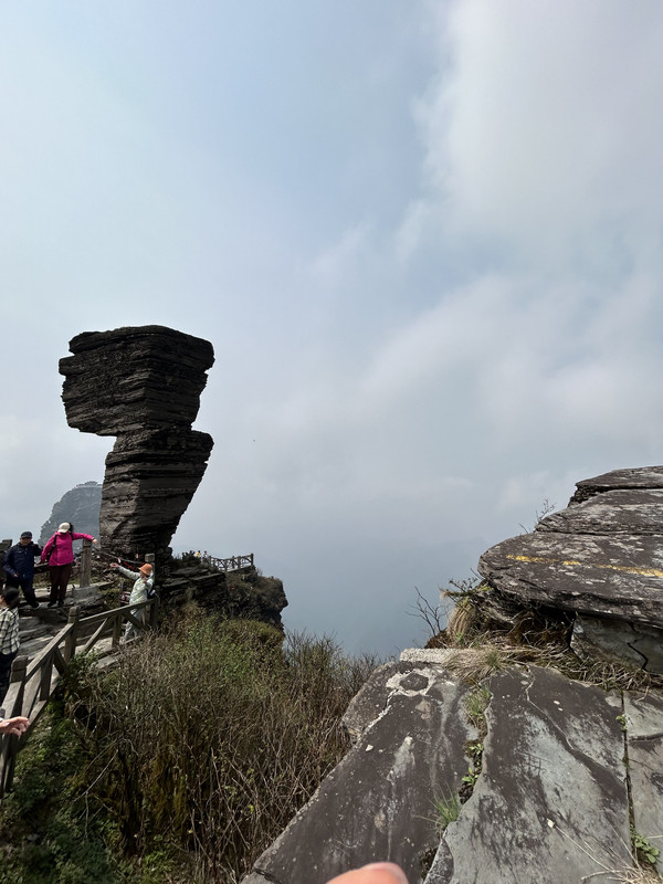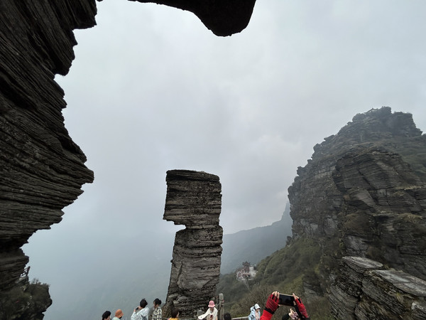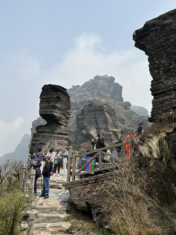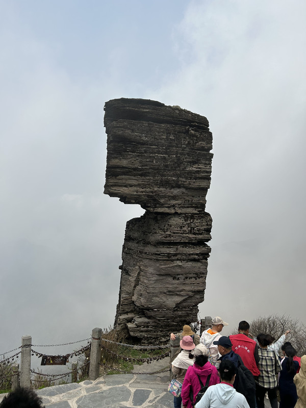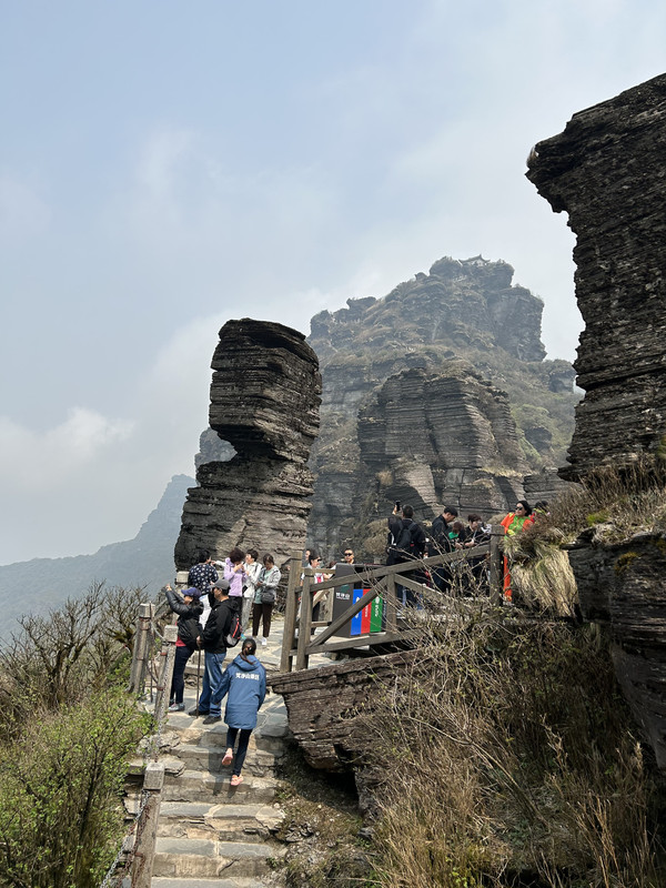 从景区门口到索道站有9.5公里距离,坐观光车25分钟左右到达索道站,然后坐索道(大约15分钟)上去后,登木栅道(1400多台阶栈道)大约40分钟,到达山顶就是梵净山标志性景物蘑菇石。蘑菇石就这么迎风傲雪巍然矗立于天地之间,既像天外飞来之物,又像是破土而出拔地而起。亿万年的风霜雪雨在它身上留下了层层痕迹,却始终改变不了昂然高傲的气势。
