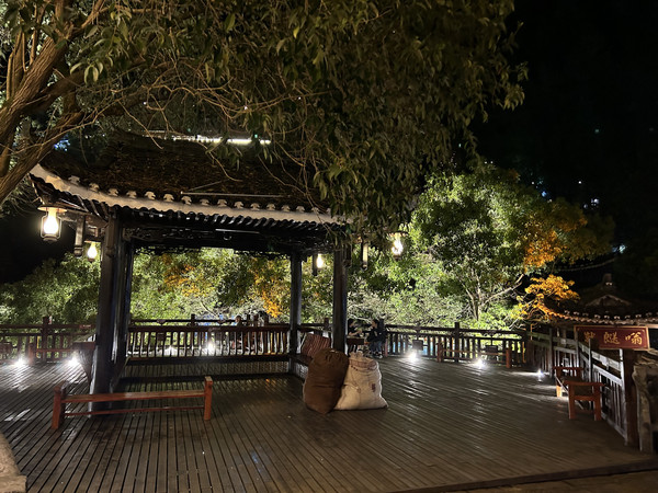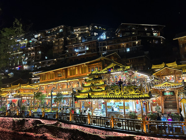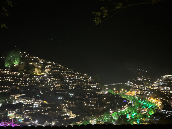 在1号风雨桥乘观光车登上观景台(步行20分钟可达),俯瞰西江苗寨全景。夜幕降临,千万盏星灯亮起,星星点点,夜景甚是壮观。
