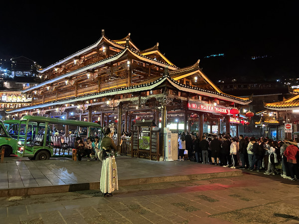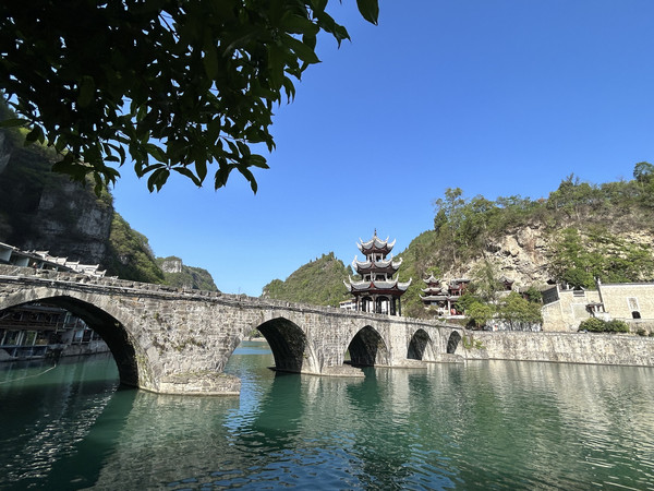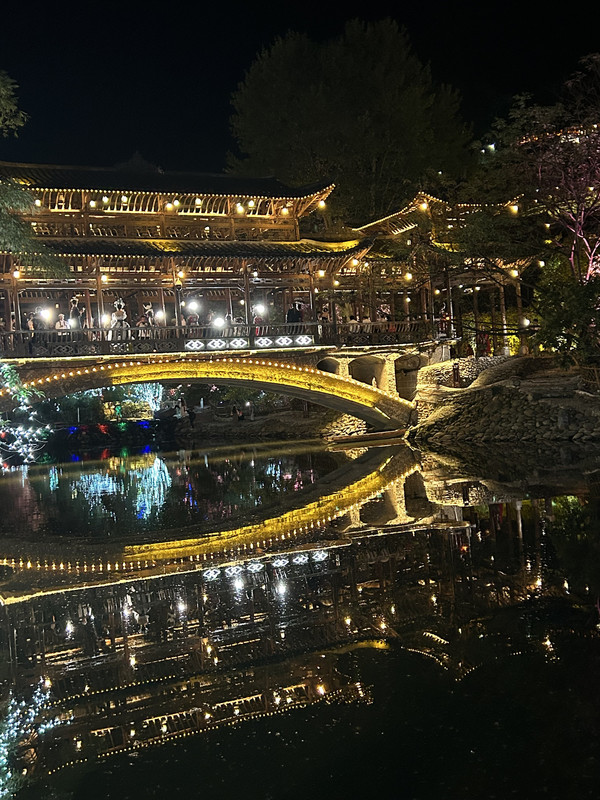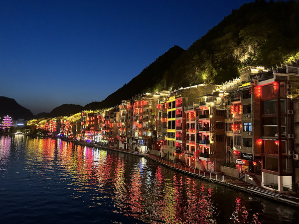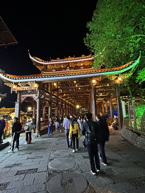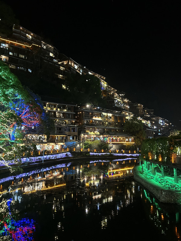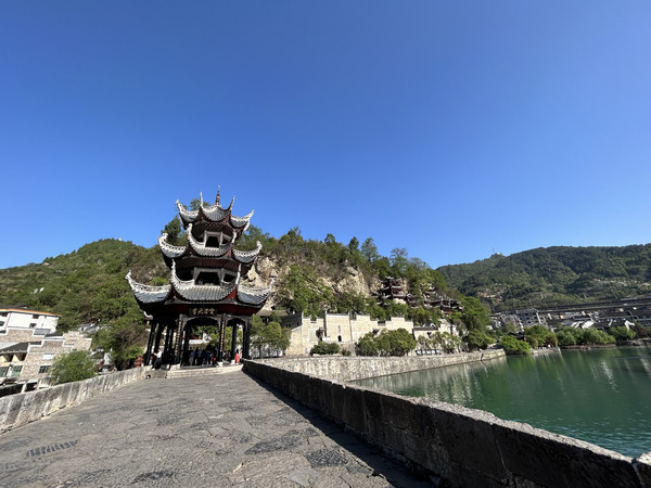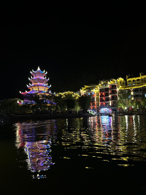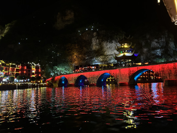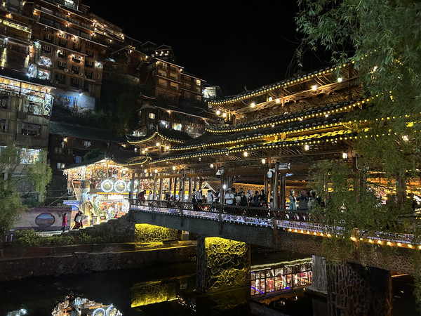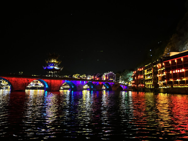 祝圣桥是古镇的地标,桥上有一座三层的亭子,这里曾是湘黔联通的主要通道,自古既有“湘黔咽喉”之称。每天晚上,祝圣桥上灯火通明,河水倒映着灯火,颇为壮观。