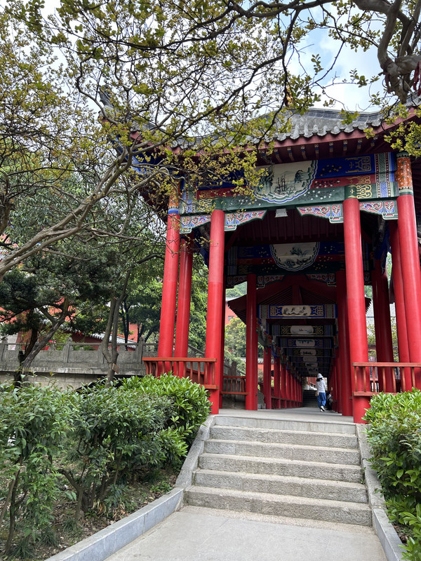 沿着九曲径拾级而上,山上植被茂密,空气新鲜,山顶有一座始建于1672年(清康熙11年)的弘福寺,由赤松和尚开创,为贵州首刹。寺内香火鼎盛,袅袅香火中,随处可见穿梭在屋顶树枝间的猕猴。