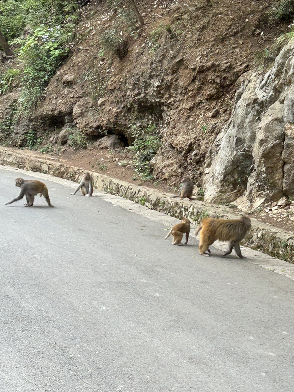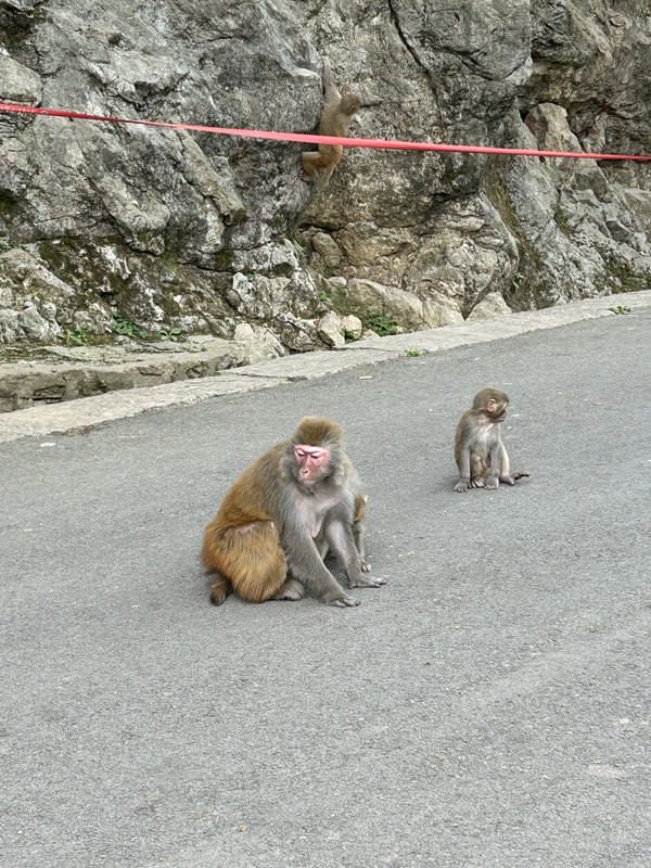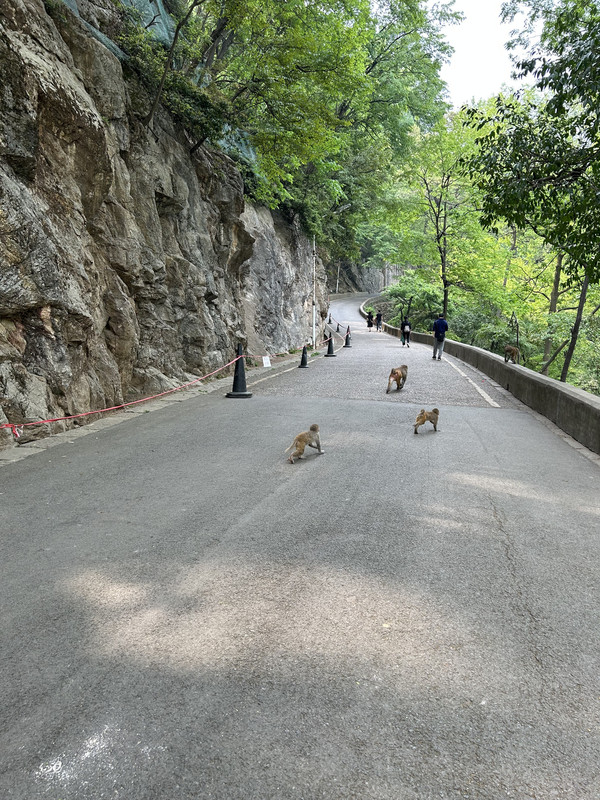 从弘福寺向左侧整整两公里左右的下山路上,到处是成群结对的猕猴,甚是壮观,有抱着小猴子的猴妈妈,有凶神恶煞的老猴子,还有萌萌的小奶猴……,这也是整个黔灵山的亮点,猴儿们是公园放养的,猴多势众,各种抢吃的,抢喝的,很是土匪……