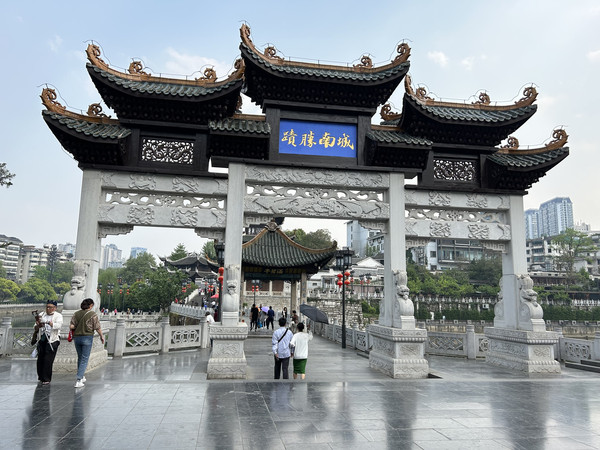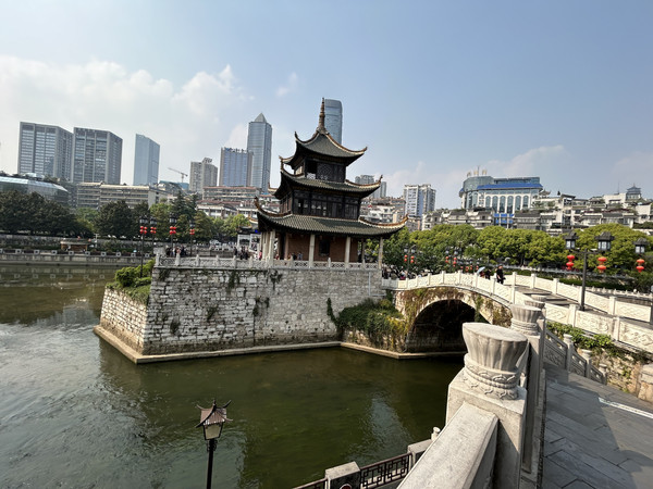 清代贵阳八景之“鳌矾浮玉”的甲秀楼,坐落在贵阳城南,这座以河中一块巨石为基而建的三层三檐四角攒尖顶的砖木结构的建筑,始建于明万历二十六年,如今保留下来的建筑为清宣统元年重建的遗存。