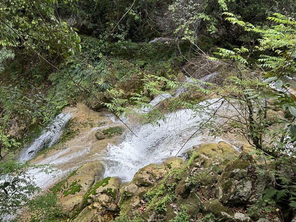 最喜欢沿河谷伴梯级瀑布而下的这一段路,也是最长的步行的一段路。只见两岸原始森林郁郁葱葱,响水河水潺潺淙淙,千姿百态的瀑布跌水构成一幅动人的水景泼墨。
