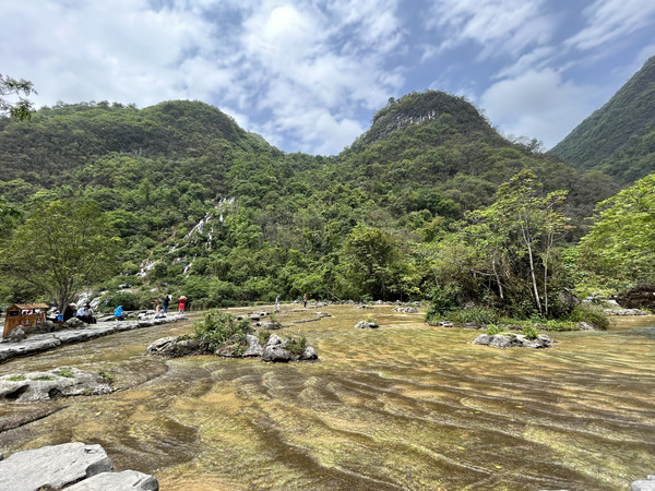 天星桥景区位于黄果树大瀑布下游7公里处,是黄果树最大的景区。天星桥景区的石景、水景、树景、洞景神奇地融合在一起,令人称奇。在这里可以发现水上有石,石中有洞,洞旁有树,不得不感慨大自然的鬼斧神工。