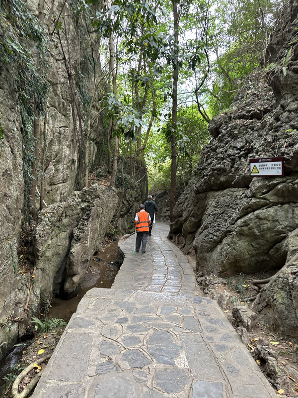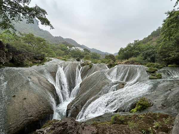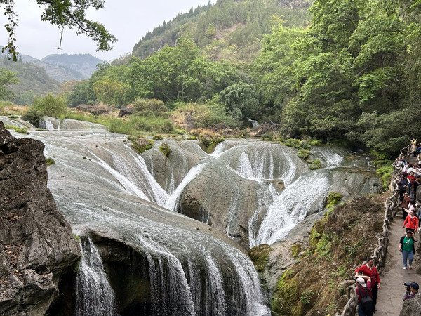 乘坐景区观光车到陡坡塘,从入口步行十分钟左右就能看到陡坡塘大瀑布。这里是83版西游记片尾曲唐僧师徒四人牵马过河的场景取景地。