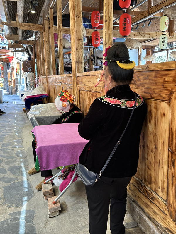 苗族大婶们身着民族服饰,头上别着艳丽的花。