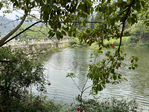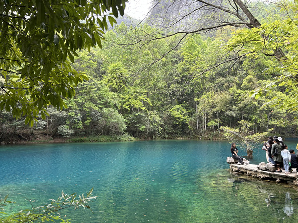 水深邃幽蓝,岸上的峰峦、绿树、竹林倒映潭中,色彩斑斓绚丽,尤入仙境。