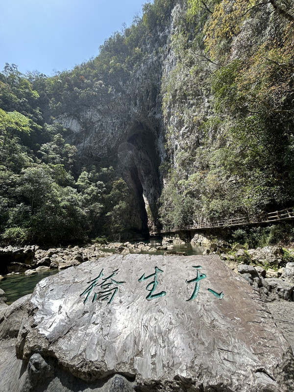 天生桥,跨江而过被专家们誉为“东方的凯旋门”,桥高60米,桥孔宽20米。桥下湍急的水流形成一道瀑布;桥孔下遍布形态各异的钟乳石;桥侧长满灌木、花草,观之令人肃然起敬,为大自然巧夺天工之神力所折服。