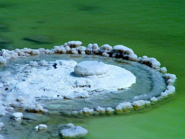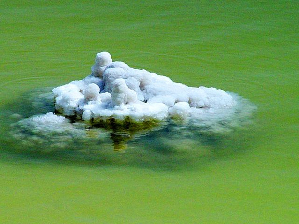 深绿色的盐湖岸边是洁白如玉的盐花结晶体,它们造型各异,好像各个都充满了灵性,煞是好看。