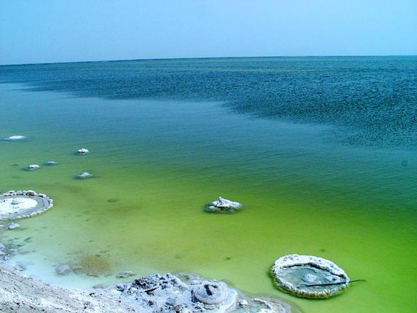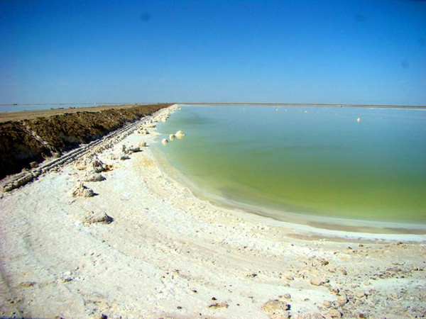 盐湖周围地势平坦,荒漠无边,但风景奇特。整个湖面好像是一片刚刚耕耘过的沃土,又像是鱼鳞,一层一层,一浪一浪。遗憾的是土地上无绿草,湖水中无游鱼,天空上无飞鸟,一片寂静的景象。