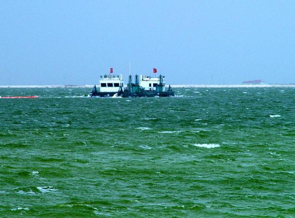 游客们来到盐湖中心码头,这里虽然是观景的最佳位置,但是风却很大,吹的人们瑟瑟发抖。看湖上,三三两两的彩色船只在湖上作业。