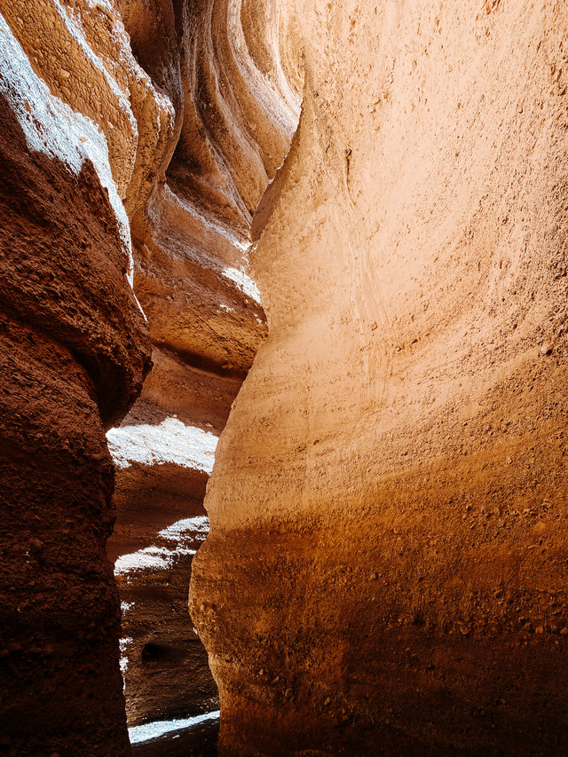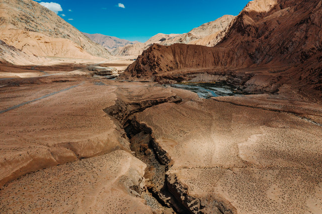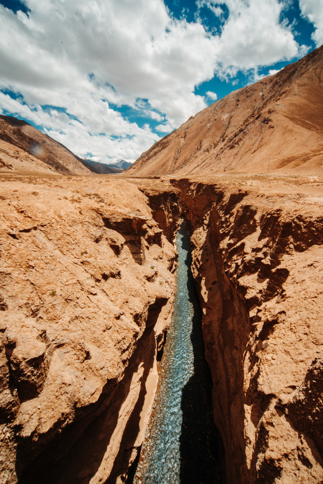 我们爬到了峡谷的上方,从这里看,又有不一样的风景。土地在眼前裂开,形成了这条峡谷,远方的雪山融化的雪水流入峡谷中形成了这条溪流。这里也是电影《天慕》的取景地。