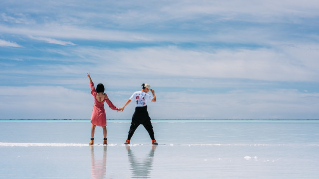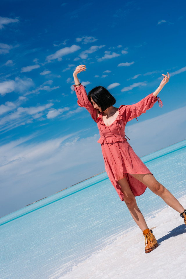 真的到湖边的时候只能说,太美了!!!!美到无法形容,果然是传说中的“马尔代夫青海分夫”。Tiffany蓝的湖水一望无际,偶尔露出一些白色的盐碱滩,是无需任何滤镜,肉眼可见的美!只能说四个字!不虚此行!