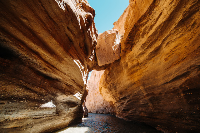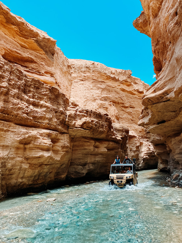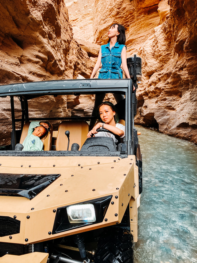 涉水段虽然才一公里左右,但是是我们从未有过的体验,坐在ATV里,两侧是金黄的峡谷,底下是湍急的溪流,我们逆流而上,有急流的位置水还会灌到车里。一路颠簸,却也刺激有趣。