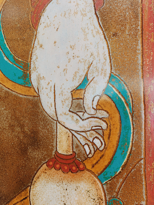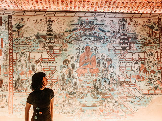 上一次来我跟吴哲都已经去过了莫高窟,所以这次我们选择了去瓜州的榆林窟看看,它也是莫高窟艺术系统的一个分支。榆林窟,又名万佛峡、榆林寺 ,位于瓜州县城南70千米处,属于敦煌研究院管辖之内。洞窟开凿在榆林河峡谷两岸直立的东西峭壁上,因河岸榆树成林而得名。和莫高窟一样,洞窟内是严禁拍照的。