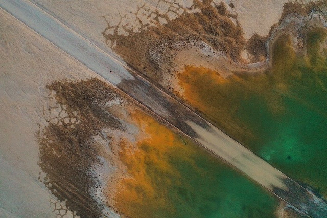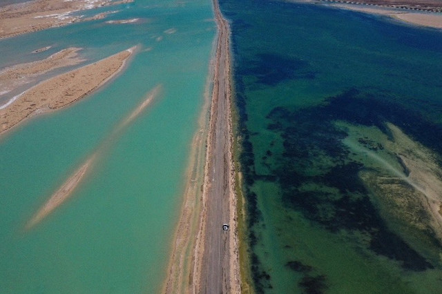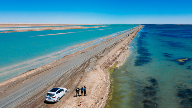 西台吉乃尔湖滨湖为第四系洪积、冲积、风积、湖相碎屑沉积和盐类化学沉积。道路两旁的湖水呈现出不同的颜色,湖边的泥很容易陷进去,所以建议在路边拍照就好。这里双向都是单车道,一定不要在道路中间停车,影响交通,往返于马路两侧的时候也要注意车辆。