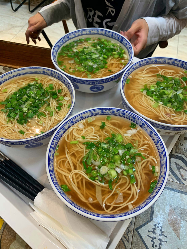 免费的牛肉面基本是素的,我们又自己加钱加了份肉,马上就变成了正宗的牛肉拉面,加上油泼辣子,每个人都是吃得连汤都不剩。