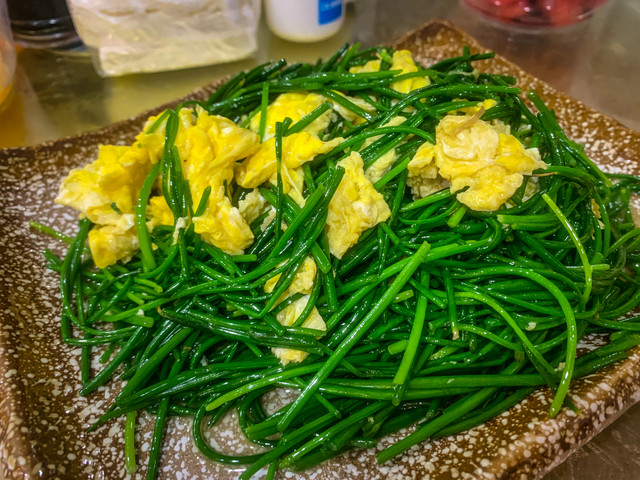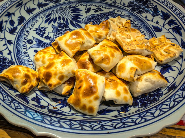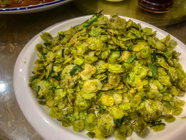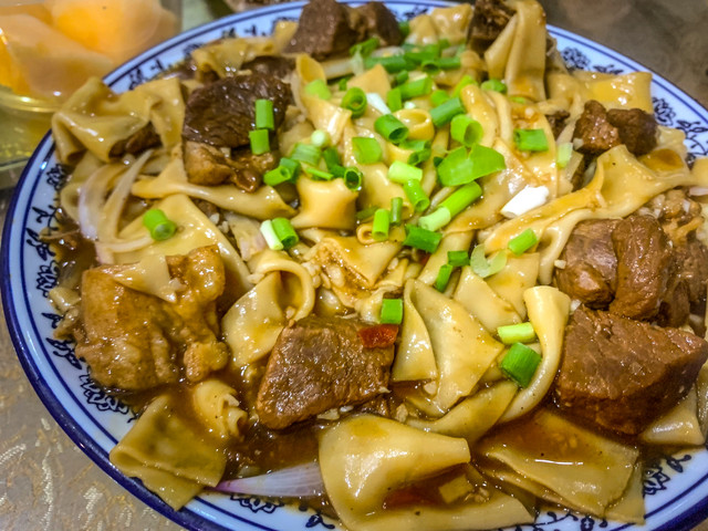 关于晚饭,真的要强烈推荐这家“大漠胡羊焖饼”。胡羊焖饼是一地道的敦煌特色菜,这家店的胡羊焖饼,羊肉炖的软烂入味,没有膻味,面皮吸满了肉汁,非常好吃。除了胡羊焖饼,炒榆钱我们也是第一次吃到。沙葱炒蛋没有葱味但是很香,我们更是吃了一份又要了一份,之后的行程每家店我们都要问有没有沙葱炒蛋 这家店的食材新鲜,服务态度也很好,值得一试