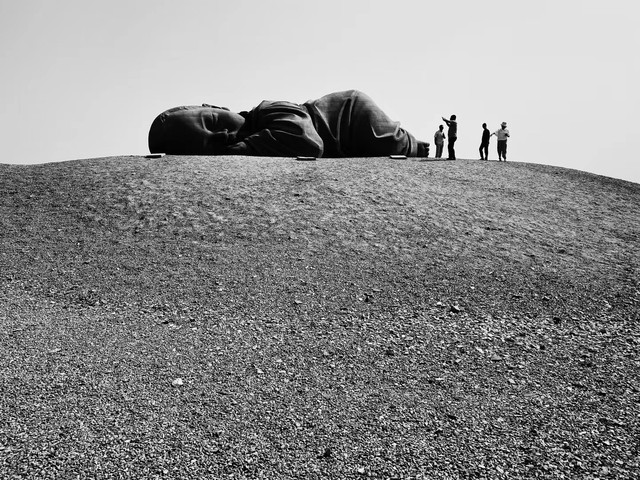 从榆林窟回来的路上,我们还经过了雕塑“大地之子”。这个雕塑位于瓜州的戈壁滩上,是清华大学的董书兵教授创作的,这座雕塑长15米、高4.3米、宽9米,是一个趴伏在地、恬然入睡的巨型婴儿。以红砂岩这种粗砾石材进行3D雕刻,最后逐块雕砌安装成型,据说教授的创作初衷是希望让路过此处的人们能珍惜地球的资源,保护环境。