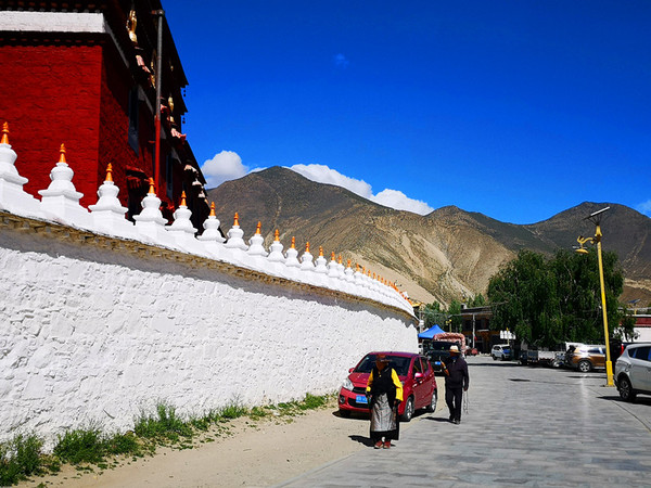 沿着铁围山向北来到了东门即正门,免费,进入寺院,嗯,佛国里正在道路改造,这里拉个警示条那里围个圈,但这似乎并未影响到藏民们虔诚地诵经、煨桑,只见袅袅烟雾弥漫于寺院各处。我们边走边细瞧,这座建于公元7世纪依照佛教密宗曼陀罗而建的“大千世界”,真看不出所以然来,佛国的世界那是我等俗人所知的。但有办法,进入乌孜大殿,购票,每人40元,再付100元,请来一位寺院讲解员,跟随他走进这佛国世界。