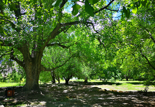跑了一段令人乏味、荒芜的山脉后,又迎来一片绿色,一打听这枝繁叶茂之地却是“朗县世界核桃园”,免费,意外蹭个景点。进入景区大门,只见一片片、一排排核桃树构成一处园林,园内的小道曲径通幽,嗯,好大一棵树呀,那粗壮的树围足以让若干个成人手牵手才能得以合拢,细看树牌标识:“千年核桃树、树龄2100年”,哈哈,“世界核桃园”当之无愧。不由分说立马与千年古树合影一张,也来个万古长青吧。