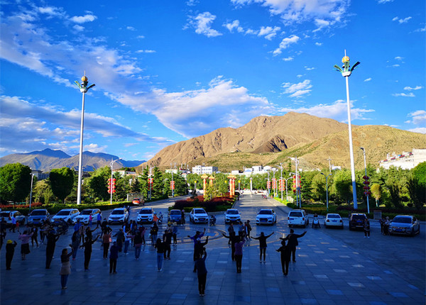 18:00时再次出酒店大门,依昨天的线路找到一家名曰“人民食堂”的饭庄,来份水煮肉片、青菜、米饭,很合胃口,吃饱喝足踱步来到时代广场。夜幕渐渐地降临了,我坐在广场上一处高高的台阶上,看着太阳慢慢地西沉,天空如此地辽阔,大地的美徐徐展现在眼前。泽当镇,“泽”意为“玩耍”,“当”意为“坝子”,“泽当”二字全意为“玩耍的坝子”,我俯视着广场上舞动着的人们,他们(她们)真对得起其祖先对“泽当”赋予的含义。这一刻,我突然感觉到怀有一颗感恩之心并学会观察和感受四周美丽的大地,有多么重要,它一定会让人们在平淡的生活中产生一种爱和幸福感的。