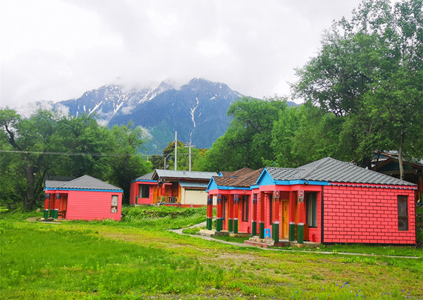 拉格桑桃花园作为民宿占地的确不小,依山傍水,曲径通幽,一栋栋小木屋或小红房掩映在婀娜多姿的绿色丛中,每年桃花盛开之时,这里便集雪山、湖泊、桃花于一体,构成了川藏线上最美的景致也引来无数观光者。