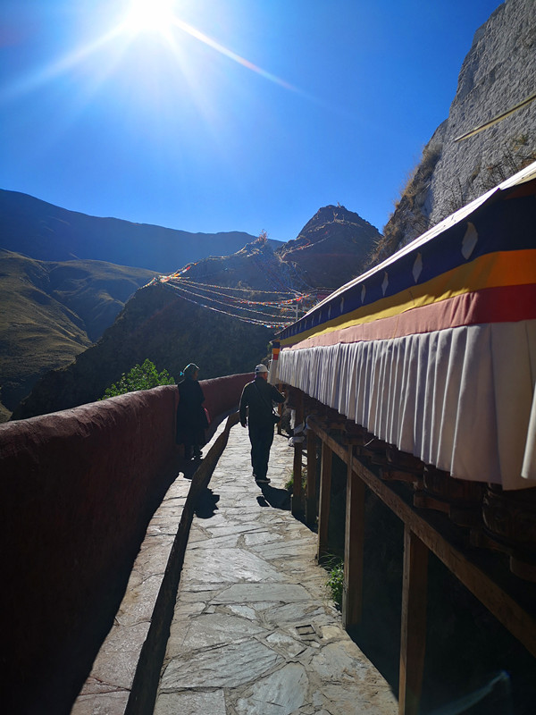 景点免费,依着指引来到入口处,数十级台阶后便是一处小院,院内古树参天,设有佛堂,佛堂旁有可提供住宿的小招待所,再环顾四周,只见三面环山,一面正对着雅鲁藏布江宽广的河谷,景色宜人,难怪这里是历代众多高僧大德修身悟法之地。从这里有多条石阶蜿蜒而至山上的修行地,据说大山里曾有108座修行洞、108座天葬台和108处神泉。我们只是拾阶随意地走了一小段,Mr.H便身心疲惫地说道,不想上去了,只能作罢。青朴修行地,于我而言,真成了打卡景点,这是从未有过的。我常自忖——到圣地来干什么?旅行的意义究竟是什么?面对着这个似空白的景点,在书写这段时,我已然放下了许多:有必要一味地追求其意义吗?有必要如此挣扎地非让自己做得更好吗?这种追求是否又落入了执着之中,是否又是一种贪欲的表现呢?如果能认清并学会止息这些贪欲,那便是造访圣地的因缘吧。