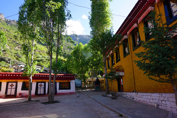 手拨动着转经桶从前绕到后,哦,一座高11米的方形高层碉堡楼,巍峨挺拔,气势雄伟,再继续绕圈至前厅,首层距地十数级石阶,前半部为门厅,厅外一个带檐的小平台,从门厅往里是佛殿。我不记得佛殿是否对游人开放,应该是未开放的,只记得门票每位60元,也许游人太少,给我们优惠至两人30元。