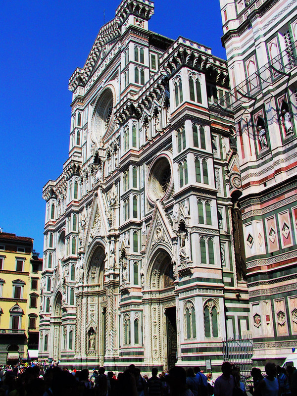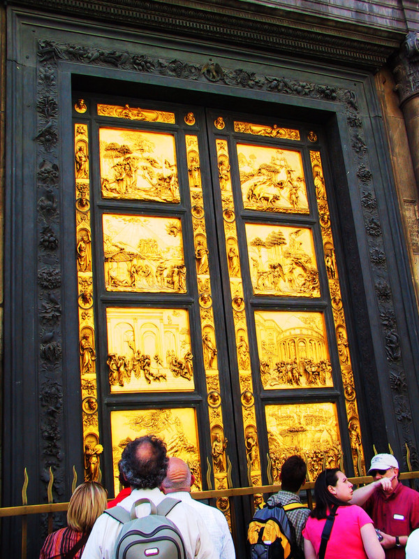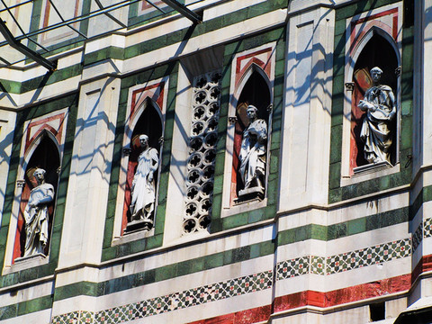 中国旅游者在佛罗伦萨都会去两个地方,圣母百花大教堂和米开朗琪罗广场。托斯卡纳人前后花了一百五十多年时间建成的圣母百花大教堂以粉、绿和奶油白三色大理石砌成,著名的圆顶是文艺复兴圆顶建筑的楷模。教堂后博物馆收藏了许多艺术品。这座教堂还可以登顶去乔托钟楼。圣母百花大教堂对面的圣乔凡尼礼拜堂是罗马式建筑的代表,三面青铜门浮雕:入口处南侧的青铜门用28张图讲述约翰传教的故事;东侧礼拜门被米开朗基罗誉为“通往天堂之门”有十张图描述亚当和夏娃及旧约圣经的题材;北侧青铜门也是28张图,主题是表现基督的生涯及其12门徒的事迹。