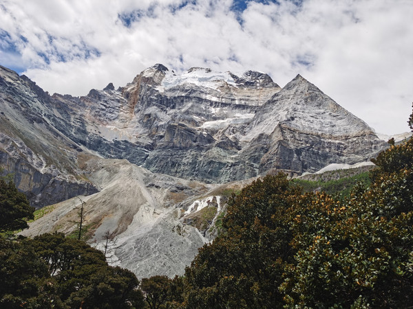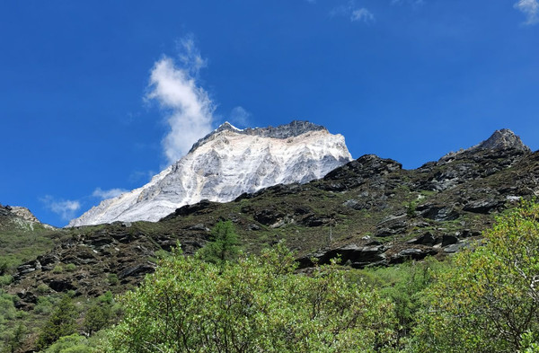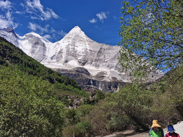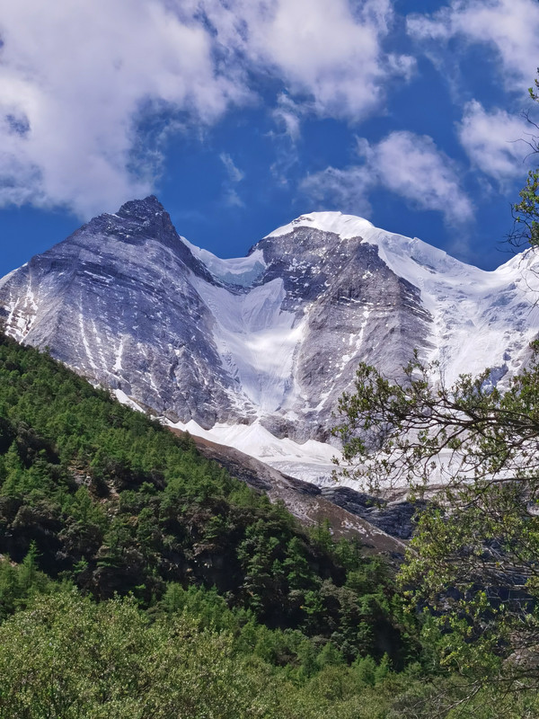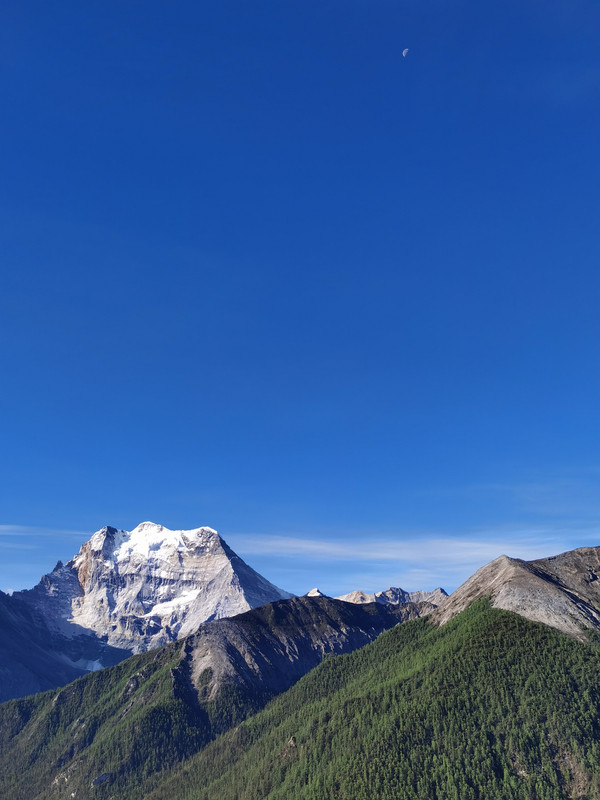 08点半,正式开始徒步。刚开始,只有草坪和森林,这段路程非常枯燥,一直见不到雪山。忽然,我看到央迈勇出现在我面前,没有一丝云彩遮挡!