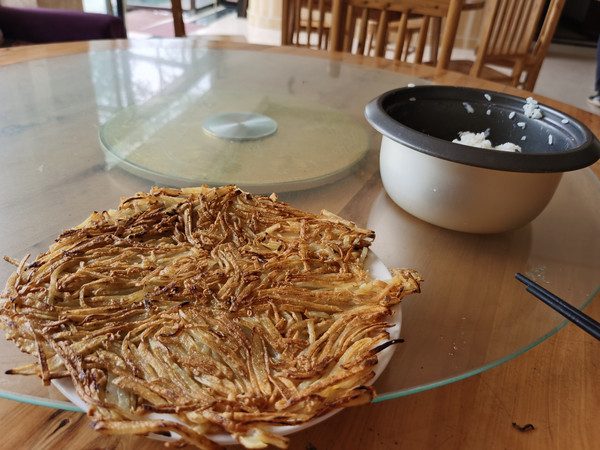 中午在农家乐点了一份土豆饼,味道实在是太香了!可能是因为饿了的原因吧。