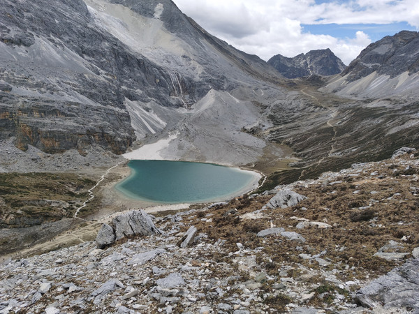继续往前走,即将抵达无人区,转头俯视牛奶海,景色比五色海稍逊一些,但是俯视着看也很震撼——这口圣水,如同翡翠般镶嵌在山间之间。