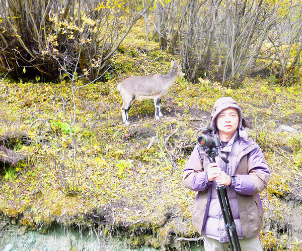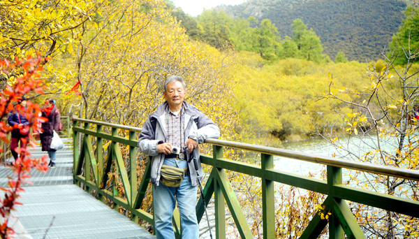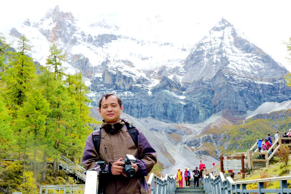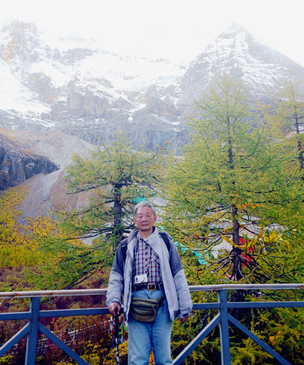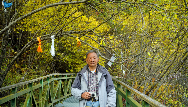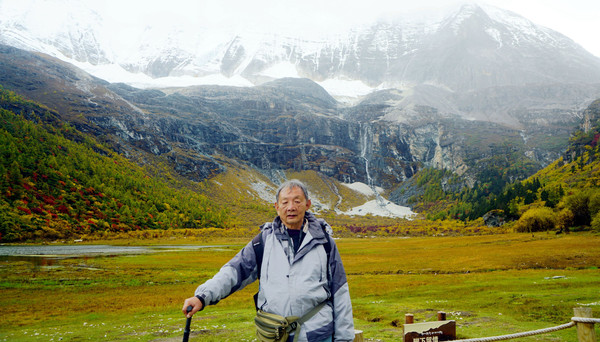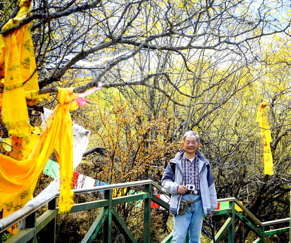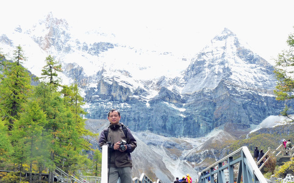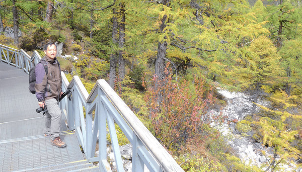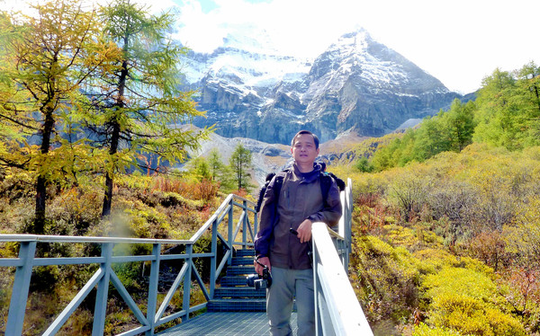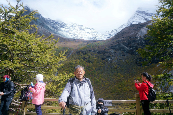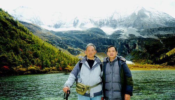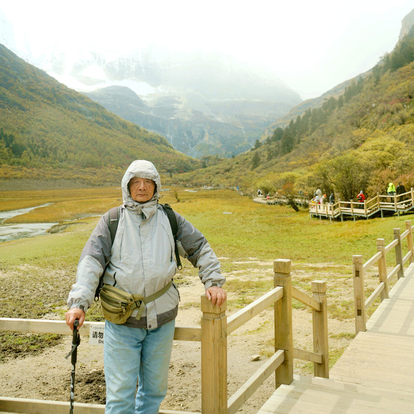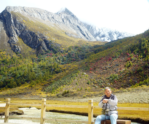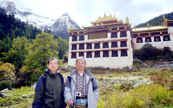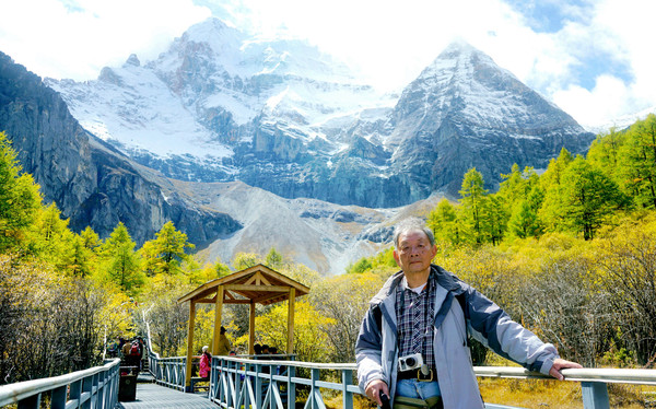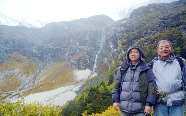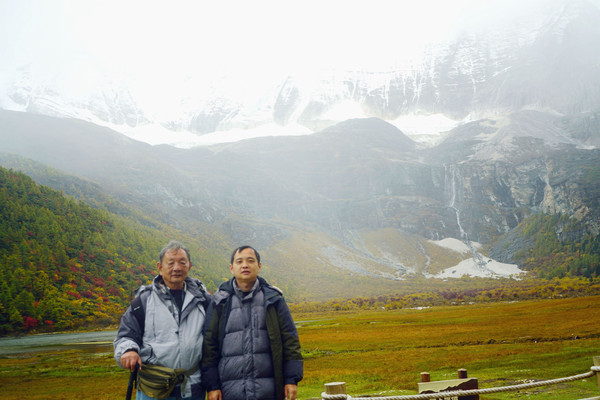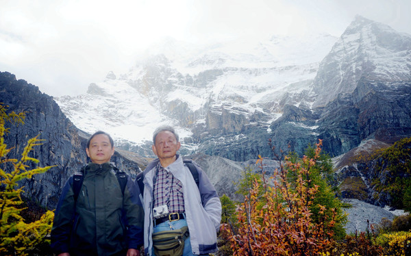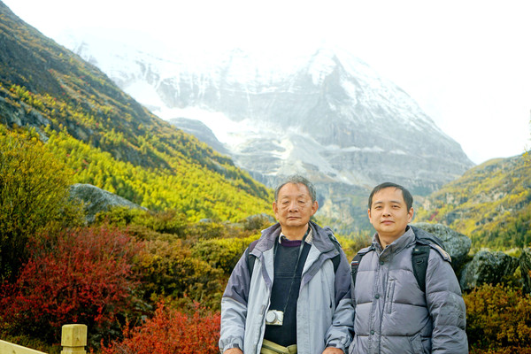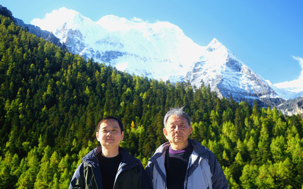 仙乃日雪峰观景台面积颇大,可以非常清晰地观赏雪山,也备有木桌椅可供游人吃饭、休息,然而,这里却并不是拍摄雪峰留念照的好地方,因为周边树木高大,取景颇难。两人只得走下观景台,在附近山坡上寻得一处空旷之地,架设起三脚架,拍摄到一张父子同游雪山的珍贵合影。