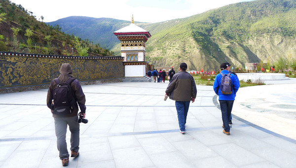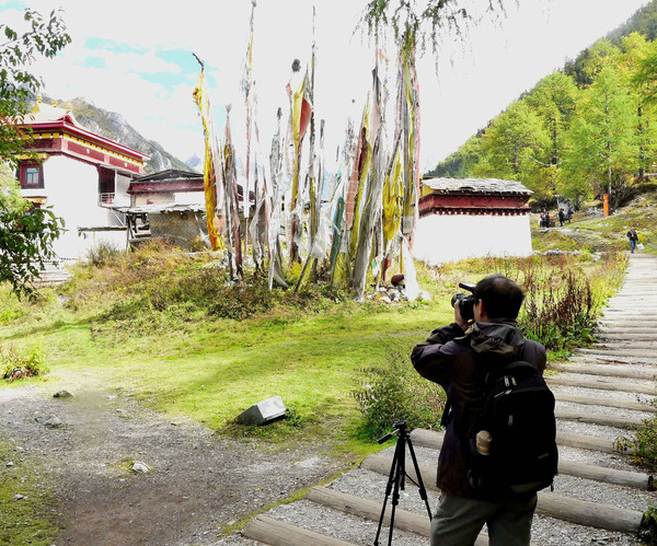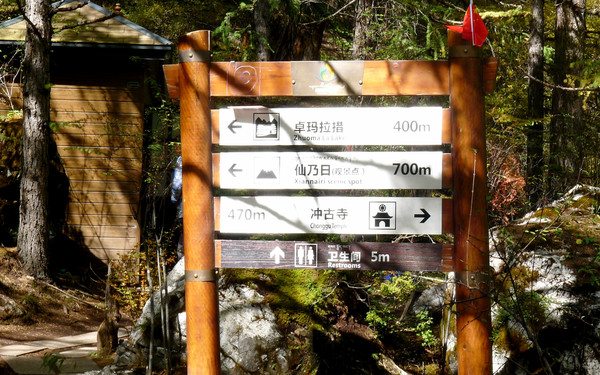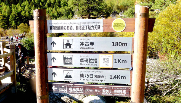 9:05回房,将全部物品装包,一人背一个双肩包下楼退房,依旧是在2号站等车,9:13乘车出发,9:27到达“扎灌崩”,下车后重走昨日走过的老路,9:51又走到“活佛灵塔”三岔路口。今天是要从这里向右走短线。路边标牌显示,此处距离冲古寺180米,距离卓玛拉措1公里,距离“仙乃日”观景点1.4公里。这点儿距离看似小菜一碟,但考虑到脚下已是海拔3996米,而且,所谓的180米、1公里和1.4公里都是水平距离,实际行走都还必须爬山,所以,就这点路途也是不可小视。我们没急于右拐登山,而是先到左手边的观景台(好像是叫做佛缘台)上拍拍照片,支起三脚架拍摄两人合影,也拍到了“央迈勇”的尖顶。