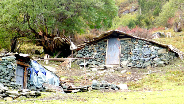 13:01看到路边有些石砌的窝棚,好像是空置,窝棚旁有野山羊活动。附近还有一道瀑布,虽属袖珍型,但却很漂亮。瀑布附近有木构观景台,配备环保厕所。我在丹巴买了四罐氧气,原意是要让X.J.在高原上驾车应急,但X.J.一路都无需吸氧,今日全部随身带上,X.J.执意让我坐下吸氧,反正是已经买了,不吸白不吸。然而,这里周边植被茂密,似乎并不缺氧,我一瓶氧气吸完,感觉跟不吸氧也没啥区别。