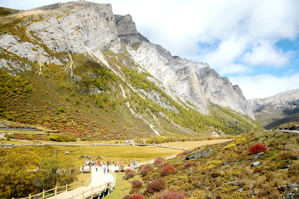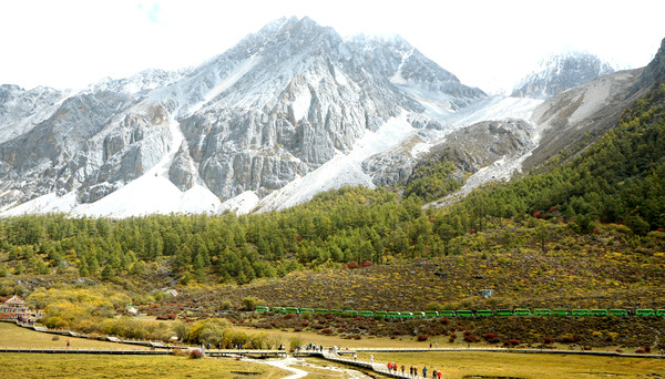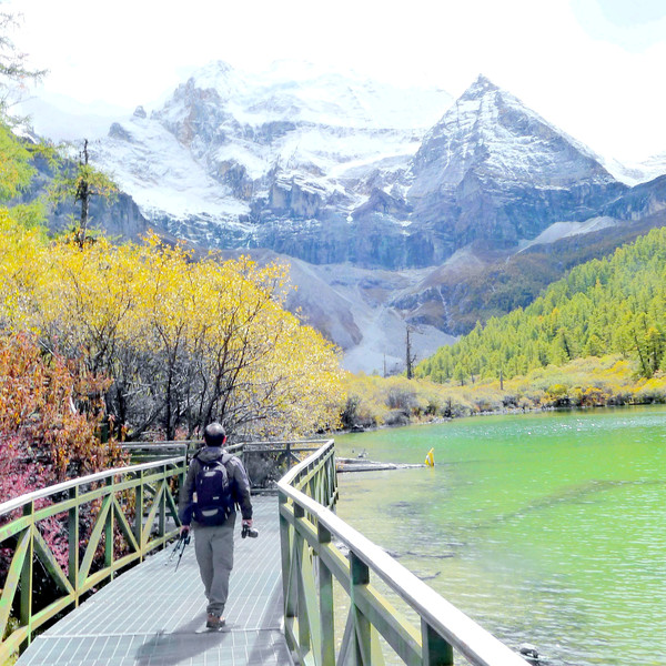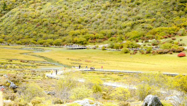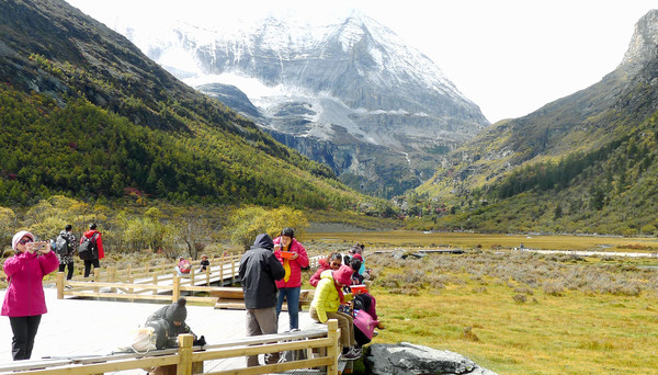也是从高处眺望,乘马点那边似乎并没有马匹守候,于是我们也就没有必要急冲冲地赶过去“抢”马,两人打算先放松一下心情,好好观景,拍拍照片。洛绒牛场上建有长长木栈道,我们沿着栈道缓缓而行,“央迈勇”雪峰已是近在眼前,于是支起三脚架,先拍张两人合影,算是打卡“到此一游”。再转身回望我们走过来的方向,长长木栈道入口处的背后就是亚丁景区的第三座雪山,“夏诺多吉”雪峰。观光车的停车场也在同一方向,停靠着一长列的绿色电瓶车。