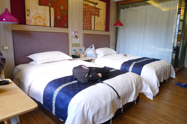 “藏亚文化酒店”的老板来自重庆,租用当地人的房屋装修后经营,声称给我们观景房,但却是背靠雪山,只能看到田园。办入住时发现总台内摆放很多登山杖,询问多少钱一根,答称不卖、只租,20元/天。然而,我们自己上楼后,发现服务员正在打扫前面旅客刚刚离去的房间,有好几根登山杖都被遗弃,扔在走廊地上,我俩各捡了一根。进入房间后稍事整理,将今日登山无需的东西全都从背包中取出,然后轻装出发。下楼时遇到老板,他见我们都已装备了登山杖,表情有点儿异样,但也没说啥。在2号车站等没多久就有车来,车上已有不少当地村民,我一上车就大呼“扎西德勒”,同样也是得到了热情的回应,一位老妇还特意告诉我应该选右侧座位,因为风景都在右侧。