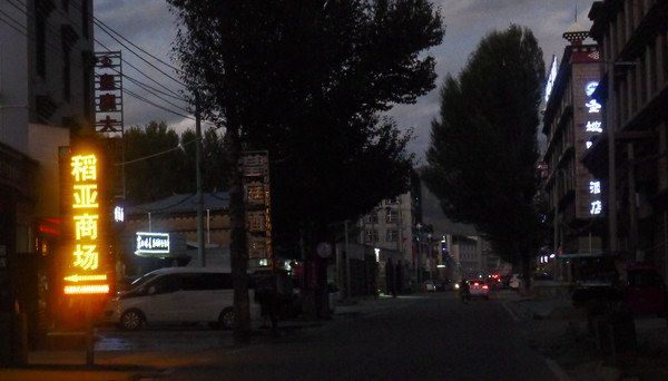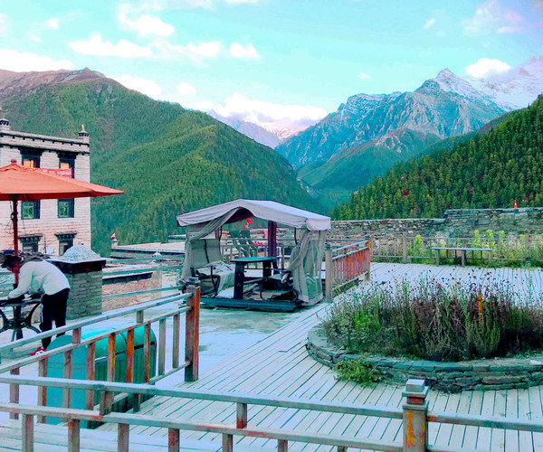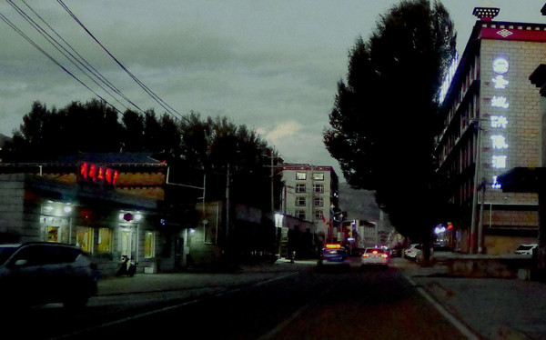 马不停蹄前往洛绒牛场游客服务中心,搭乘景区电瓶车,17:54返回“冲古寺服务中心”,18:11走到“扎灌崩服务中心”的景区交通车站。此处有两个候车站点,其一是发往“香格里拉镇”游客服务中心,其二是发往“亚丁村”。发往香格里拉镇的班车一部接着一部,发往亚丁村的班车却是很久才来一趟。18:34回到“藏亚文化酒店”,两人此刻方才注意到,原来宾馆门前还有一座景色颇佳的小院,从这里就可以看到“仙乃日”与“央迈勇”两座雪峰,央迈勇的尖顶清晰可见。