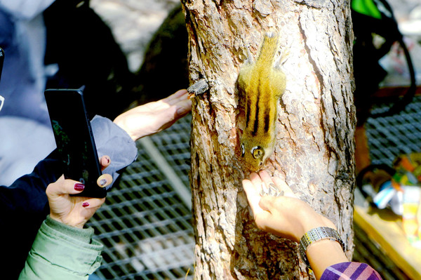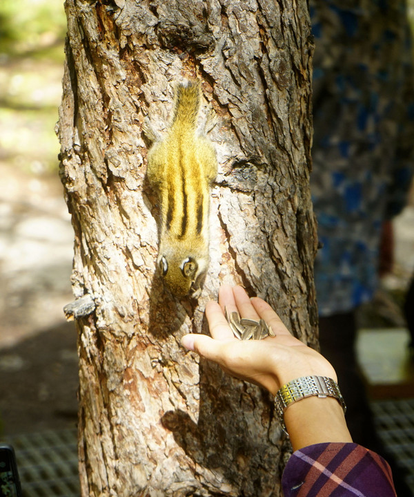 11:17走到钢架阶梯路上的一处休息点,此处有登山沿途仅有的卫生间、有一座比较大的亭子、附近还有土路直通山下冲古寺。路标显示:从这里往前,距离卓玛拉措400米,距离仙乃日观景台700米,从这里往后,距离冲古寺470米,当然,这里讲的都是水平距离。游人纷纷在这里休息,山上的松鼠和鸟儿们也都聚集过来来蹭吃,它们都不拍人,直接从游人手上获取食物。
