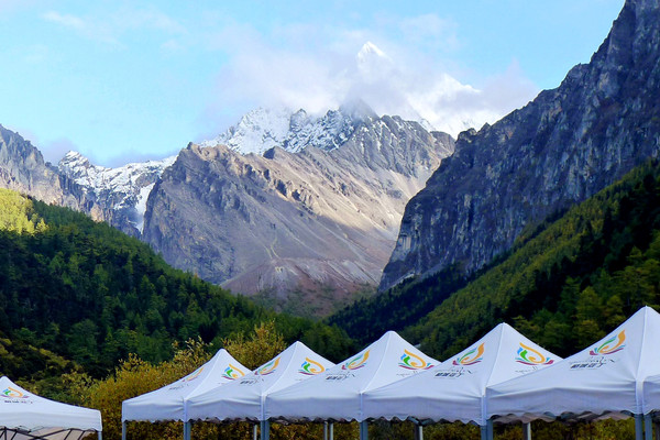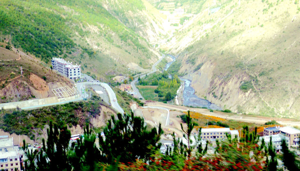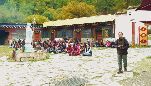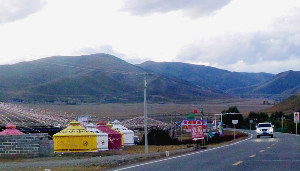 大约10:30开车,邻座的一位藏族汉子跟我聊天,他说亚丁村原本是很穷的地方,现在发展旅游,日子好过多了,每年还有一季虫草,一季松茸,还能再赚不少钱。听说我住“藏亚文化酒店”一天要400多元,他说他家也开旅馆,因为是自家的房子,成本低,一天只要200多。他还给我一张名片,他家的宾馆名叫“彭措民宿”,位置也是在2号车站附近。我告诉他我们是从网上预定宾馆,他说他家的宾馆也已挂在网上。我问他是否在景区内工作,他说没有,今天景区内的“冲古寺”要做法事,周边很多寺庙的大和尚都要过来,仪式很隆重,他要赶过去参加。亚丁村距离扎灌崩不到7公里,行车仅为10多分钟而已。