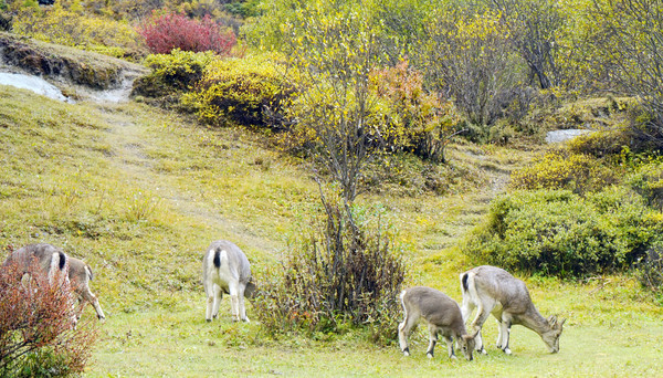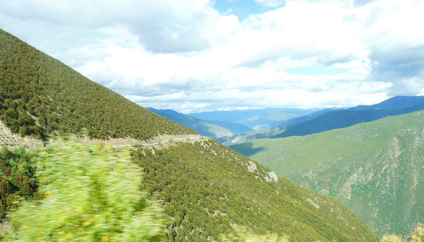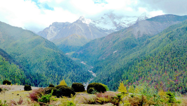11:45抵达洛绒牛场,停车场位于高坡之上,下车后站在高处眺望,脚下就是广阔、漂亮的牛场,也就是当地村民放养牦牛的地方。水草丰美,山川秀丽,相对于牧场的面积,牦牛好像是并不太多,载畜量不大,优美的生态环境就可以长期保持。