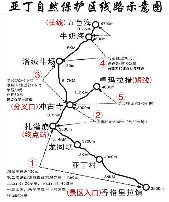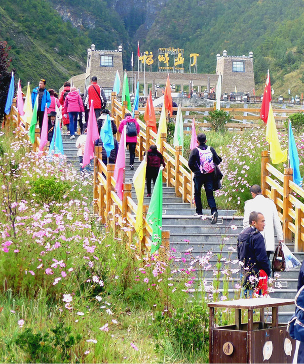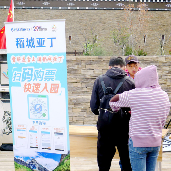 游客中心距离亚丁景区还有40多公里,必须搭乘景区交通车前往,乘车点设置在高坡上,登高路上有专人用手机收费,266元/人(景区门票+交通车往返票)。X.J.购买一张全票,我只须购买交通车票,购票时录入身份证号码,然后只须刷身份证即可搭乘交通车、进入景区。